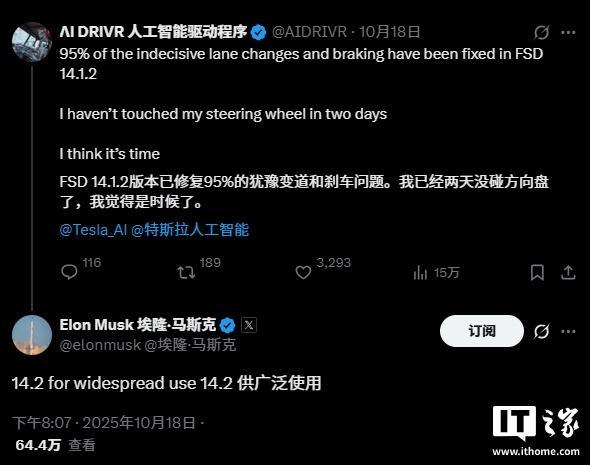 IT之家注意到,马斯克的这一表态是对特斯拉车主、长期 FSD 测试者 AI DRIVR 所发布内容的回应,AI DRIVR 指出,是时候向整个车队推送 FSD 功能了,因为 FSD V14.1.2 版本已经变得非常成熟。