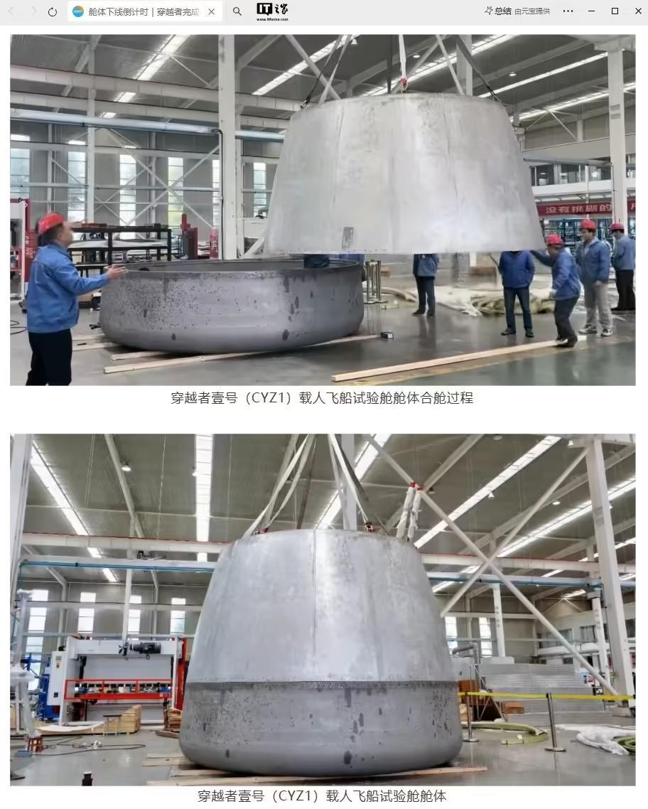 IT之家 11 月 12 日消息,中国首家商业“载人航天科技”有限公司北京穿越者宣布,其研制的国内首艘 1:1 全尺寸商业载人飞船试验舱舱体 —— 穿越者壹号(CYZ1)顺利完成整体合舱工作,整体装配形状、位置公差达到设计指标,计划于本月 15 日举行下线仪式。